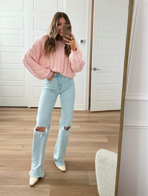 I felt like the ultimate cool girl in this look—effortlessly stylish, cozy, and confident. The pink sweater gave me that soft, feminine energy, while the ripped jeans and sleek boots added just the right amount of edge.